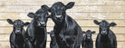 The dramatic contrast between the glossy black coats of the cattle and the distressed cream-and-tan wood planks creates visual depth and authenticity. Each animal is painted with careful attention to detail—from the gentle curves of their faces to the characteristic white markings on their noses—while the horizontal wood grain adds movement and rustic charm throughout the composition.