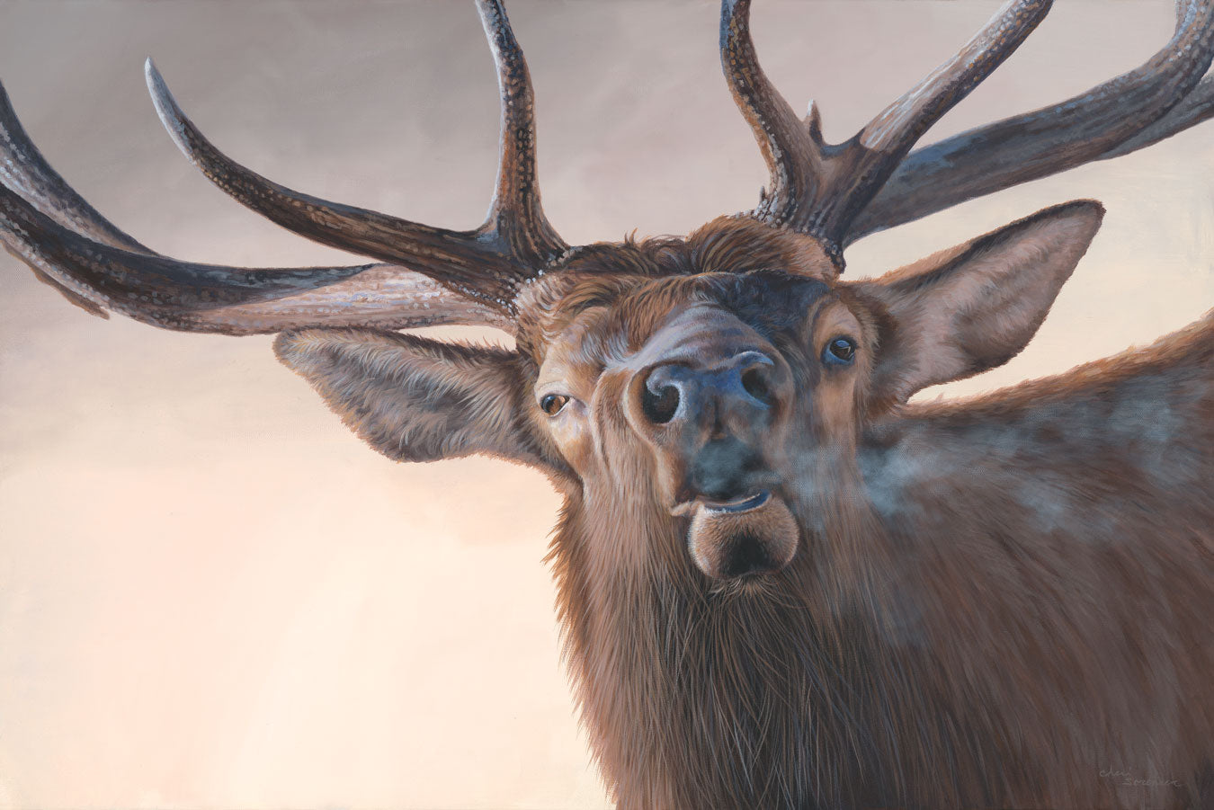 The painting showcases Cheri's exceptional ability to render texture and dimension. Each strand of the elk's thick winter coat is meticulously painted, highlighting the rich tones of cream, brown, and grey that define his regal appearance. The magnificent antlers, weathered and textured, spread dramatically across the composition, their multi-point structure testament to the bull's maturity and strength.