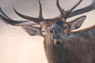 What makes this piece particularly captivating is the intimate perspective—the elk seems to regard the viewer with a knowing, almost curious expression, creating an immediate connection between subject and observer. Set against a soft, neutral background that suggests the misty atmosphere of early morning, the elk emerges as the undisputed focal point, commanding attention while maintaining an air of natural grace.