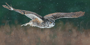 Cheri's masterful technique brings extraordinary life to every detail: the intricate barring of flight feathers, the soft rufous tones warming the owl's plumage, and the delicate interplay of falling snow against a moody teal-to-taupe sky. The atmospheric background evokes the hushed mystery of a winter's evening, while the owl itself radiates intensity and grace.