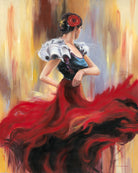 This captivating acrylic painting captures the passionate essence of flamenco in bold, expressive brushstrokes. The dancer, viewed from behind, commands attention in her traditional costume—a flowing red and black skirt that swirls with dramatic movement, paired with a fitted teal bodice and white polka-dotted sleeves. A vibrant red rose adorns her dark hair, adding an authentic Spanish flair.