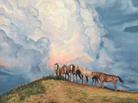 The composition draws the eye upward from the sun-bleached grasses and scattered sage of the hilltop to the horses themselves—each rendered with distinctive character and posture—before releasing into the vast, turbulent skyscape above. The contrast between the solid earth and the dynamic atmosphere creates a powerful sense of the wild west's endless horizons.